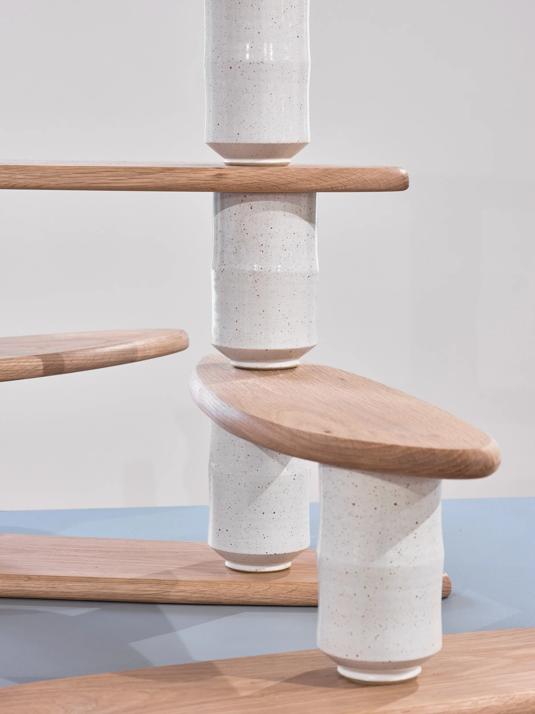 Sécan is a sculptural modular system consisting of ceramic bone structures and solid oak blades. Approached by County Hall Pottery, Pottery West asked Ben to work together to produce something new for the Collaborative Exhibition part od London Design Fair 2025. As a team we spoke about human existence, the common law of gravity, how massive objects can seem light, about ancient primordial space, and time. Their focus wasn’t on creating a product. Sécan means to ‘search’ or to ‘seek’, just as children play around with drift wood of bones found on a beach. Ben, Matt & Cat (Pottery West) had fun playing with these elements.